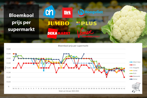 Jumbo en Albert Heijn gaan in week 42 gelijk op en verhogen de bloemkoolprijs allebei met 10 eurocent naar €1,95 per stuk. DekaMarkt voert eenzelfde prijsverhoging door en komt uit op €1,89.