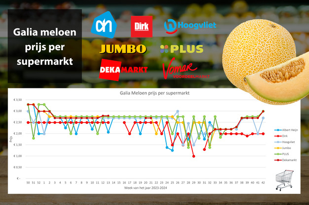 Vier van de zes gevolgde supermarkten verhogen de Galiaprijs in week 42. Albert Heijn, Jumbo, Plus en DekaMarkt gaan gelijk op en verhogen de prijs naar 2,99 euro per stuk. Dirk houdt de prijs op 1,99 euro en Hoogvliet, na de forse aanbieding van vorige week, op 2,69 euro.