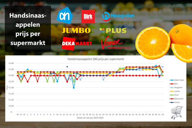 De prijs van handsinaasappelen gaat bij Albert Heijn in week 42 met 40 cent omhoog. Jumbo, Plus en DekaMarkt zetten handsinaasappelen juist in de kijker met kortingen van 36 tot 70 eurocent.