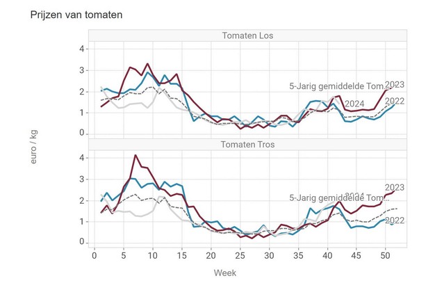 De prijs voor trostomaten is doorgestegen afgelopen week bij de VBT-veilingen. De gemiddelde kiloprijs komt hiermee boven de 2 euro uit: 2,195 euro is er gemiddeld over heel week 42 betaald.