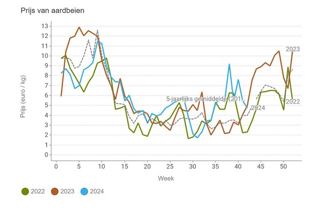 De middenprijs voor aardbeien zakt de afgelopen tijd weer wat terug. Het aanbod heeft zich weer hersteld, nadat er even weinig product beschikbaar was.