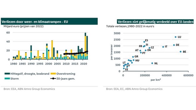 Gegevens van het Europees Milieuagentschap laten zien dat in de periode 1980-2022 naar schatting een totaal verlies van 650 miljard euro (in prijzen van 2022 en gelijk aan 4% van het bbp van 2022) is geleden door klimaat- en weerrampen in de EU. Ongeveer 43 procent van het totaal werd veroorzaakt door hydrologische rampen (voornamelijk overstromingen), 29 procent door meteorologische rampen (zoals storm en hagel) en de rest door klimatologische rampen, waarvan ongeveer 20 procent hittegolven en ongeveer 8 procent droogte, bosbranden en koudegolven samen. De jaarlijkse impact van klimaat- en weergerelateerde kan rampen volatiel zijn, maar de trend lijkt duidelijk toe te nemen. Het voortschrijdend gemiddelde over 30 jaar is gestegen van ongeveer 12 miljard euro in 2010 tot ongeveer 18 miljard euro in 2022, waarbij de totale kosten gelijk waren aan 0,3% van het bbp in 2021 en 2022.