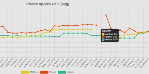 Normaal gesproken verschillen de prijzen van Gala-appelen flink tussen deze drie landen. Maar tegen midden oktober zijn de prijzen in Moldavië, Polen en Oekraïne echter dichter bij elkaar gekomen. Momenteel variëren ze van $0,51 tot $0,53 per kg voor standaardkwaliteit appelen die geschikt zijn voor de verse markt.