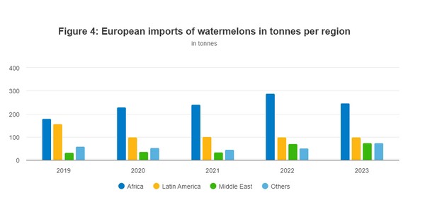 Ondanks de sterke Europese oogst van watermeloenen (bijna 3 miljoen ton in 2023), is de Europese markt nog steeds sterk afhankelijk van import om aan zijn behoeften te voldoen. In de afgelopen vijf jaar is de import van watermeloenen gestaag toegenomen, van 428.000 ton in 2019 tot 496.000 ton in 2023. Dit is een stijging van bijna 16%. De watermeloenmarkt blijft zich ontwikkelen dankzij het brede scala aan variëteiten dat op de markt wordt gebracht.