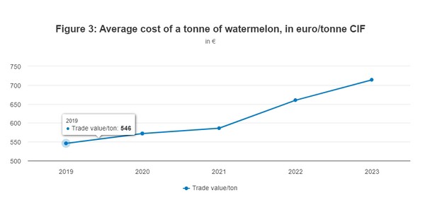 Watermeloenen worden in Europa voornamelijk geïmporteerd over zee of over de weg, wat beide zeer kosteneffectieve transportmiddelen zijn. De gemiddelde kosten van een ton watermeloen geïmporteerd uit niet-Europese landen zijn sinds 2019 gestaag gestegen. In 2019 bedroegen de gemiddelde kosten (kosten, verzekering en vracht - CIF) van een ton watermeloen €546/ton. In 2023 bedroegen deze kosten €714/ton, wat neerkomt op een stijging van iets meer dan 30%.