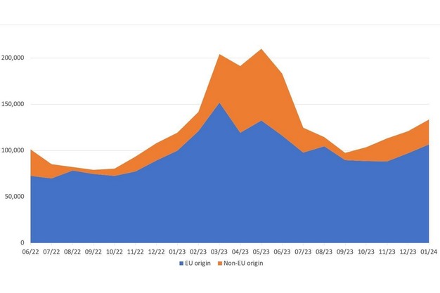 De Europese import van uien is de afgelopen vijf jaar relatief stabiel geweest. Over het geheel genomen is er een licht negatief samengesteld jaarlijks groeipercentage (CAGR) van -1,2% over de hele periode. De grootste groei werd opgetekend in 2023, toen de Europese import met 17% steeg ten opzichte van 2022 als gevolg van uitdagende klimaatomstandigheden die leidden tot lagere oogsten binnen Europa.