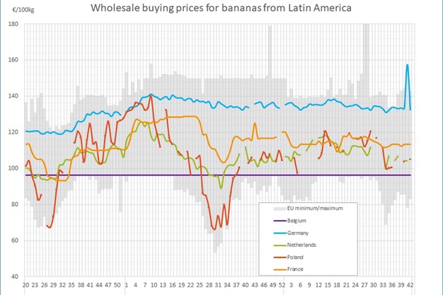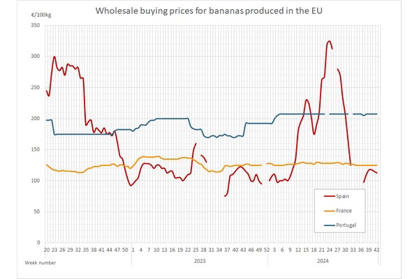In week 42 bedroeg de gemiddelde groothandelsprijs van ACP-bananen €113 per 100 kg in Spanje, terwijl de prijs in Portugal stabiel bleef op €208 per 100 kg.