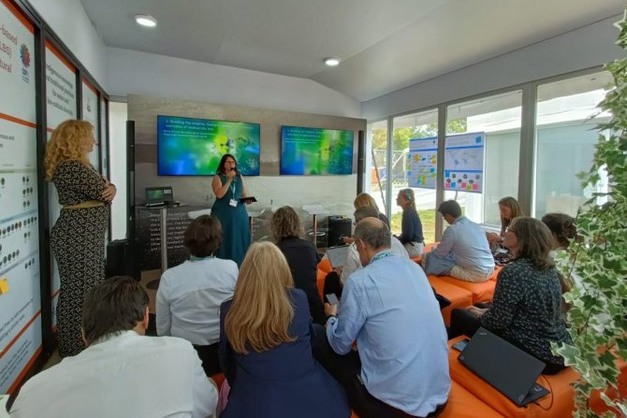 Onderzoeker Maria Naranjo-Barrantes geeft een presentatie over natuurgerelateerde risico's en kansen voor de financiële sector op COP16 in Columbia