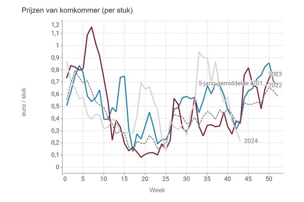 De komkommerprijzen zijn hard aan het dalen. Het brengt de prijs voor week 43 op ruim 21 eurocent.