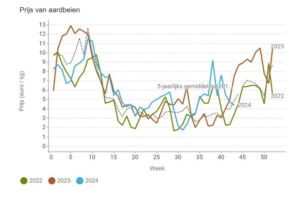 De middenprijs voor aardbei is tot net onder het vijfjarig gemiddelde gedaald. Een kilo leverde gemiddeld 4,37 euro op.