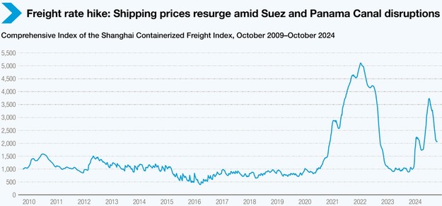 Halverwege 2024 was de Shanghai Containerized Freight Index (SCFI) meer dan verdubbeld ten opzichte van eind 2023. Volgens de laatste beschikbare gegevens was de SCFI op 18 oktober 2024 45% lager dan het hoogste niveau in 2024 en 60% lager dan het recordniveau tijdens de coronapandemie. De SCFI bleef echter 115% boven het gemiddelde van voor de pandemie en meer dan het dubbele van het gemiddelde voor 2023.