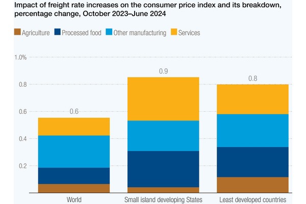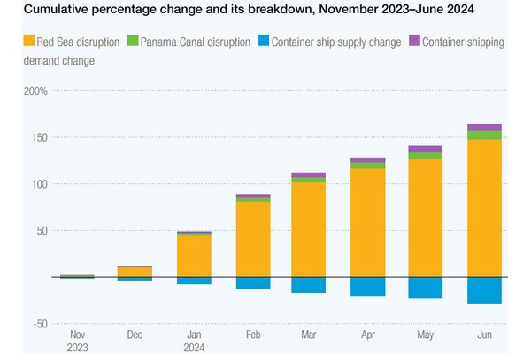 Evenzo geven de berekeningen van de organisatie aan dat de crisis in de Rode Zee en de verstoringen van het Suezkanaal 148 procentpunten hebben bijgedragen aan de cumulatieve stijging met 120% van de China Containerized Freight Index tussen oktober 2023 en juni 2024.