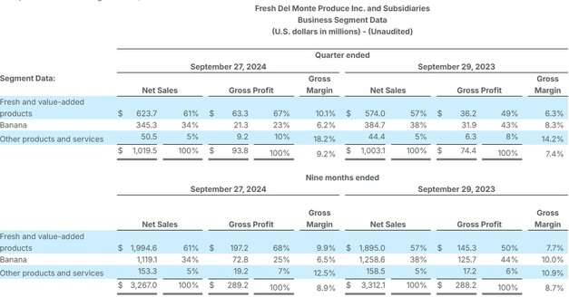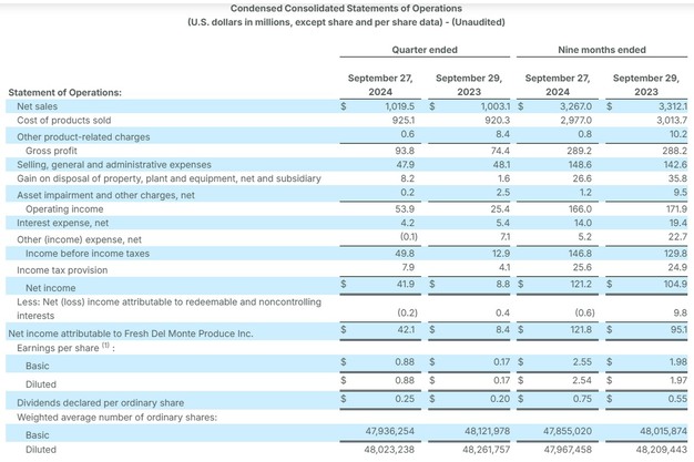 De netto-omzet voor het derde kwartaal van 2024 bedroeg $1.019,5 miljoen vergeleken met $1.003,1 miljoen in de periode vorig jaar. De stijging van de netto-omzet was voornamelijk te danken aan een hogere netto-omzet in het segment verse producten en producten met toegevoegde waarde van het bedrijf als gevolg van een hoger verkoopvolume en hogere verkoopprijzen per eenheid, voornamelijk voor avocado en ananas, als gevolg van een sterke marktvraag. De stijging werd gedeeltelijk tenietgedaan door een daling van de netto-omzet in het bananensegment van het bedrijf, voornamelijk als gevolg van concurrentiedruk op de markt.