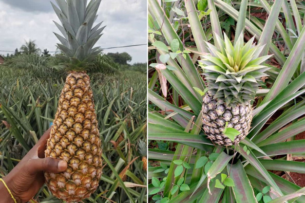 "We telen twee soorten ananas in Benin, de Sugar Loaf-variëteit, die een langwerpige flesvorm, gele schil en zoete witte binnenkant heeft, en tussen de 1 en 13 kg weegt. De tweede variëteit is de gladde Cayenne, die een ronde vorm heeft, een gelige, vezelige schil, en zoet is ongeacht de kleur, met afmetingen variërend van 1 tot 17 kg," zegt Chogolou.