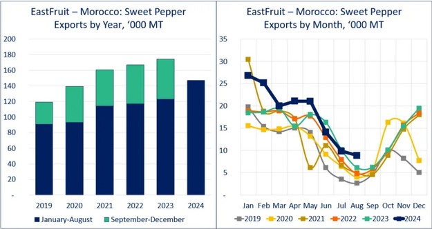 Volgens EastFruit staat Marokko op het punt om een nieuw exportrecord voor paprika's te vestigen. Dit jaar heeft de export van tomaten, een belangrijk onderdeel van Marokko's groenten- en fruitsector, ook een positieve trend laten zien. In het segment paprika's was de exportgroei nog opmerkelijker. Van januari tot augustus hebben Marokkaanse leveranciers bijna 150.000 ton paprika's geëxporteerd.