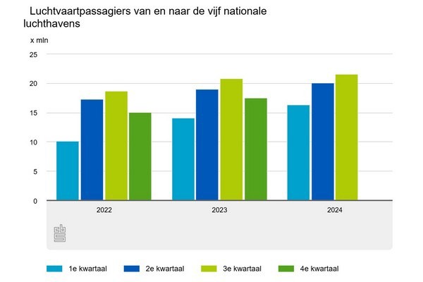 In het derde kwartaal van 2024 reisden 21,6 miljoen luchtvaartpassagiers van en naar een van de vijf Nederlandse luchthavens van nationaal belang. Dat is bijna 4 procent meer dan in hetzelfde kwartaal van 2023. Ook nam het aantal vluchten in het handelsverkeer, vervoer van passagiers en vracht tegen betaling, toe met ruim 2 procent tot 145,9 duizend. Dit meldt het CBS op basis van nieuwe cijfers.