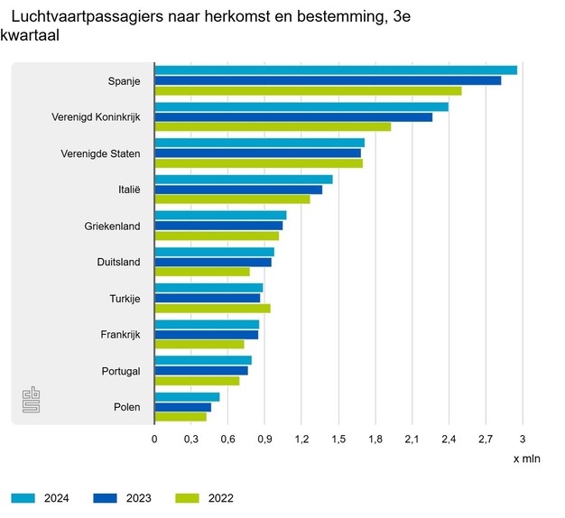 Ruim 75 procent (16,3 miljoen) van alle luchtvaartpassagiers vanuit Nederland reisde in het derde kwartaal van 2024 van en naar een bestemming binnen Europa. De populairste herkomst- en bestemmingslanden binnen Europa waren Spanje (3,0 miljoen), het Verenigd Koninkrijk (2,4 miljoen) en Italiƫ (1,5 miljoen).