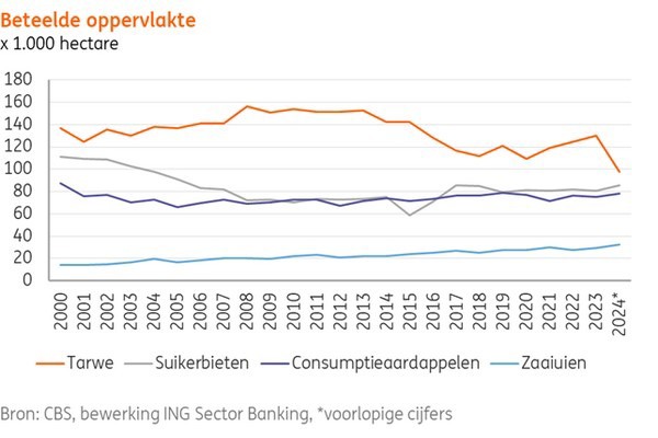 Volgens de voorlopige oogstraming akkerbouw is de bruto-opbrengst van zaaiuien in 2024 vergeleken met een jaar eerder met bijna 15 procent gestegen naar 1,5 miljoen ton. Ook de bruto-opbrengst consumptieaardappelen is groter (7 procent). Voor beide gewassen wordt er meer geoogst vanwege een toegenomen beteelde oppervlakte (areaal). De opbrengst van suikerbieten is naar verwachting 3 procent lager, blijkt uit de voorlopige oogstraming akkerbouw van het CBS.