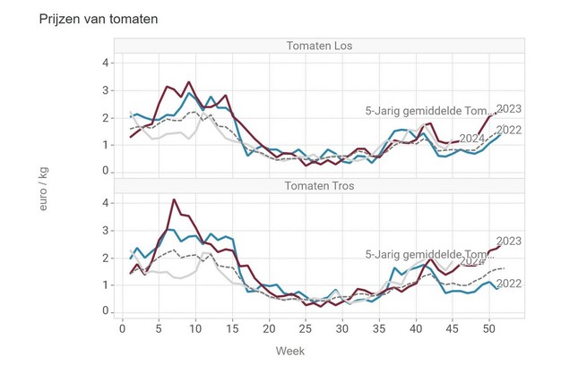 De middenprijs voor losse tomaten ligt op net geen 1,23 euro per kilo. Trostomaten worden nog een stuk beter betaald: 1,89 euro per kilo. Daarmee liggen de prijzen boven de prijzen van vorig jaar, en valt voor trostomaten op dat de prijs al sinds medio september boven de prijzen van 2023, en het vijfjarig gemiddelde ligt.