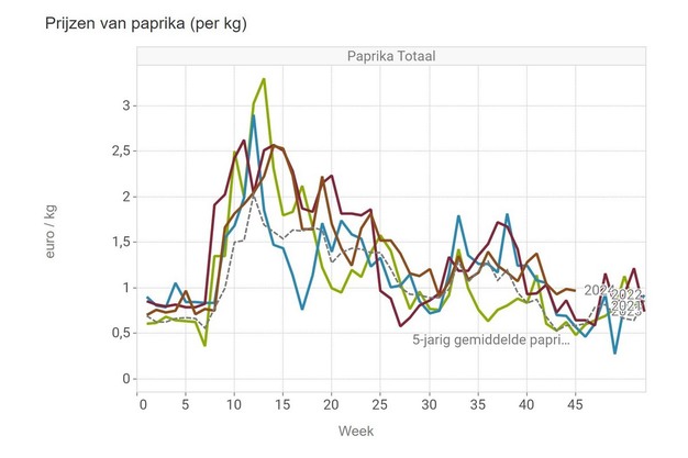 De paprikateelt loopt nu echt op zijn eind. De laatste weken ligt de prijs boven de prijzen van de afgelopen jaren. Als we alle kleuren op een hoop gooien, levert het bij het VBT een middenprijs op van ruim 0,95 euro per kilo.