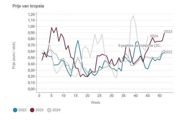 De middenprijs voor kropsla stijgt begin november ook. De gemiddelde prijs voor een krop in week 45 is 84 eurocent.