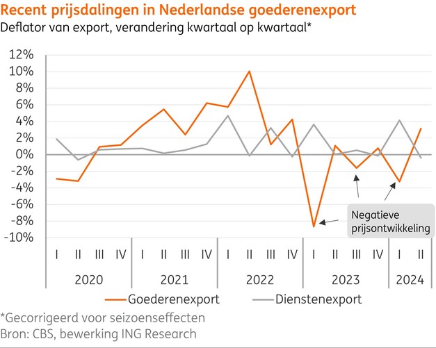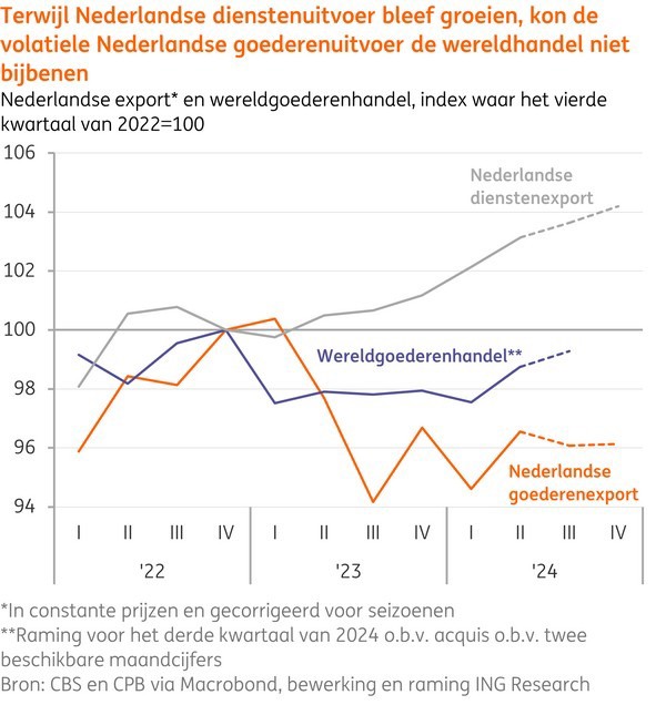 Ongeveer een derde van de Nederlandse economie is direct of indirect afhankelijk van de vraag uit het buitenland. Maar sinds de tweede helft van 2023 wisselen in de export krimp en groei elkaar elk kwartaal af. Terwijl de dienstenuitvoer gestaag blijft toenemen, gaat de goederenexport met horten en stoten. De correctie op de goederenhausse gedurende de coronaperiode, de Europese energiecrisis en de bijbehorende correctie van voorraadniveaus hebben tot een terugval van de vraag geleid. De Nederlandse goederuitvoer blijft de afgelopen kwartalen achter bij de ontwikkeling van de totale goederenhandel in de wereld.