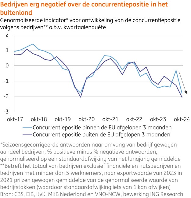 Terwijl de consument koopkrachtstijging geniet en ook weer meer uitgeeft, zien we al met al dat Nederlandse exporteurs weinig optimistischer zijn geworden over de exportverwachtingen. Dit terwijl ze in het derde kwartaal waarschijnlijk weer krimp in de buitenlandse afzet hebben ervaren. Het exportbeeld is er voor Nederlandse bedrijven met de herverkiezing van Donald Trump als president van de VS, met name in latere jaren als daadwerkelijke handelstariefverhogingen zijn ingevoerd, niet echt beter op geworden. Dit niettegenstaande de mogelijk positieve effecten op kortere termijn van anticipatie op handelsbarrières en een mogelijk compenserende impuls van de recent goedkoper geworden euro. Daarnaast kan een mogelijke verbreding van de zwakte in de Duitse economie de Nederlandse export meer raken en houdt de in transitie zijnde Chinese economie de vraag vanuit Azië op een lager pitje dan we jarenlang gewend waren.