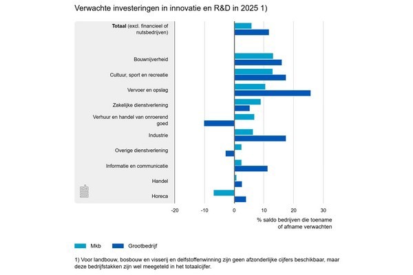 Per saldo verwachten ondernemers in zowel het mkb als in het grootbedrijf in 2025 een toename van hun investeringen in innovatie en R&D. Met een saldo van bijna 12 procent zijn die verwachtingen in het grootbedrijf positiever dan in het mkb (6 procent). In het mkb zijn ondernemers in de bouwnijverheid en de cultuur, sport en recreatie het meest positief gestemd over de investeringsverwachtingen voor innovatie en R&D. Alleen mkb-bedrijven in de horeca verwachten hierin minder te investeren. Bij de meeste bedrijfstakken zijn de verwachtingen in het grootbedrijf positiever dan in het mkb. In het grootbedrijf zijn de verwachtingen het meest positief in de vervoer en opslag.