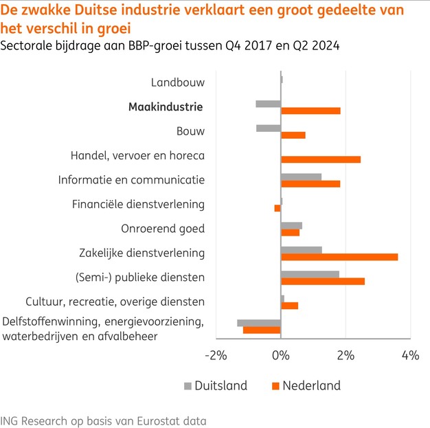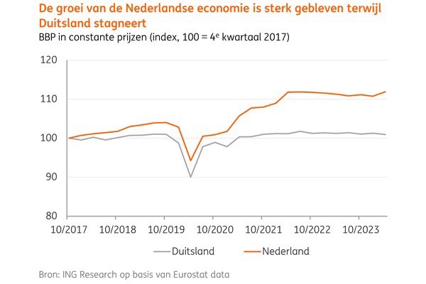 De afgelopen jaren is de Nederlandse economie sterk gegroeid terwijl Duitsland stagneert. Dit kan door een verschillend economisch verdienmodel en minder afhankelijkheid van de zwakste Duitse sectoren. Als het Duitse probleem verbreedt, lijkt Nederland daar echter wel meer hinder van te ondervinden
