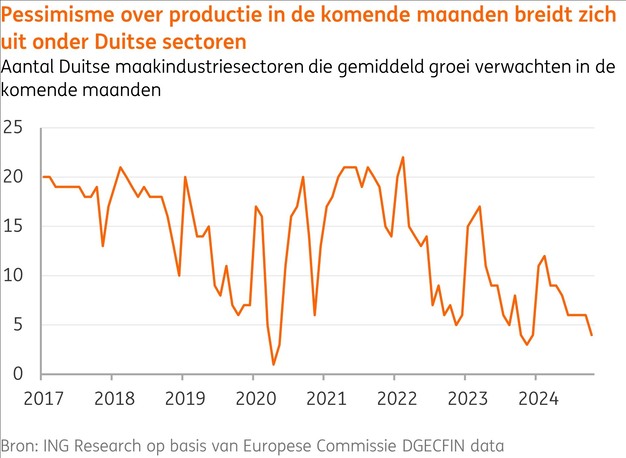 Gezien de blijvend hoge Nederlandse afhankelijkheid van de Duitse economie is de kans hoog dat de Duitse misère Nederland toch nog raakt. Zeker als de huidige stagnatie in Duitsland steeds meer sectoren gaat raken. Kijkende naar bedrijfsenquêtes, dan worden steeds minder Duitse sectoren optimistisch over de productie in de komende maanden. Momenteel zijn er nog maar 4 uit de 23 rapporterende sub-sectoren in de maakindustrie gemiddeld positief over hun productieverwachtingen voor de komende maanden. Dat zijn bijvoorbeeld de voedselsector waar Nederland relatief veel aan levert, maar ook de 'overige transportmiddelenindustrie' waar defensiemateriaal onder valt.