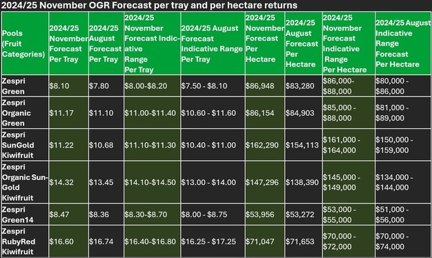Zespri heeft de novemberraming voor het seizoen 2024/25 gepubliceerd met een verwacht rendement in bijna alle categorieën dat hoger is dan bij de vorige prognose in augustus.