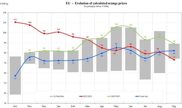 In september bedroeg de gemiddelde prijs voor sinaasappelen in de EU €73 per 100 kg, wat een daling van 17,83% betekent ten opzichte van dezelfde maand in 2023. Deze prijsdaling weerspiegelt een bredere trend op de Europese sinaasappelmarkt, die zowel wordt beïnvloed door teeltuitdagingen als door externe handelsinvloeden.