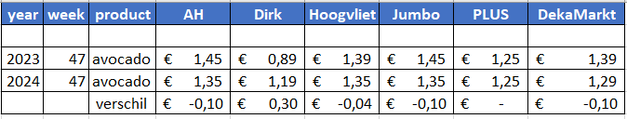 Prijsdata zijn afkomstig van Supermarktscanner.nl en gebaseerd op de online prijzen in de webwinkels van Albert Heijn, Jumbo, Plus, DekaMarkt, Dirk en Hoogvliet. De prijs is een gemiddelde, inclusief de promoties. In deze prijsvergelijking zijn herkomst en kwaliteit niet meegenomen. De meeste supermarkten vermelden deze gegevens niet op hun website, Hoogvliet en Jumbo vermelden het land van herkomst. Mogelijk worden in de bovenstaande prijsvergelijking onrijpe avocado's met rijpe vergeleken en Spaanse komkommers met Hollandse.