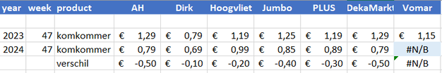 Van een seizoenseffect in komkommer is nog geen sprake. De prijsverhoging van PLUS in week 46 is in week 47 weer omgezet naar een prijsdaling, maar de prijs blijft hoger dan in de weken ervoor. Ook AH en Dirk verlagen de prijzen, wat duidt op voldoende beschikbaarheid. Opvallend is dat komkommer bij Vomar ontbreekt in het online assortiment.