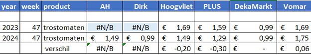 Gekeken naar week 47 in 2023 liggen de prijzen in 2024 lager, met uitzondering van Vomar. Opvallend: trostomaten waren in 2023 zowel bij Albert Heijn als Dirk die week niet beschikbaar.