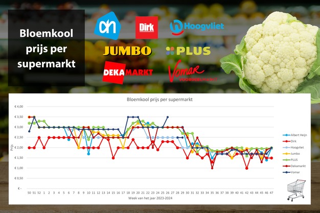 Na een verwarrend beeld vorige week, zit de bloemkoolprijs toch echt in de lift, Albert Heijn komt na de aanbieding van vorige week in week 47 terug met 1,99 euro per stuk, 23 cent hoger dan in week 45. Ook de meeste andere supermarkten hanteren deze prijs, Hoogvliet zit er met 1,95 euro. De prijsverlaging naar 1,49 euro per bloemkool bij Dirk houdt stand.
