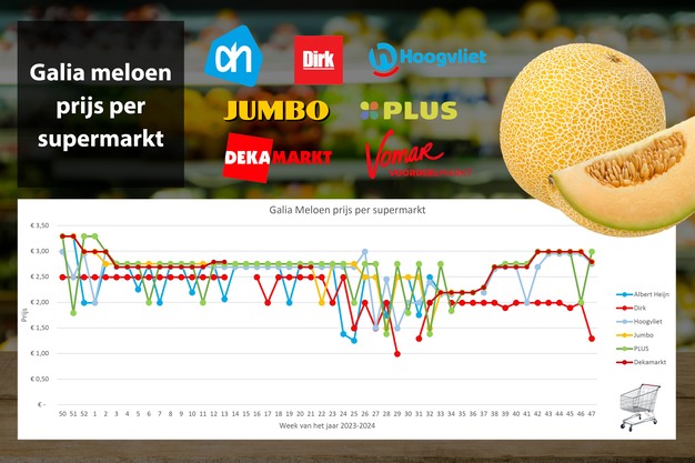 Er was in week 47 blijkbaar veel Galia op de markt, met uitzondering van PLUS die in week 46 een flinke aanbieding had, want de andere supermarkten hadden een aanbieding lopen. Ze maakten Galia 20 cent voordeliger, Dirk is altijd al flink voordeliger dan de rest, maar valt extra op door nog eens 70 cent van de prijs af te halen.