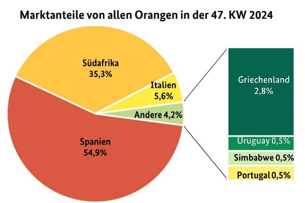 Hoewel de aanwezigheid van Spaanse sinaasappelen aanzienlijk toenam, lag deze nog steeds onder het niveau van vorig jaar. Er waren voornamelijk Navelina sinaasappelen in verschillende maten beschikbaar. Newhall uit Portugal, die 2,20 €/kg kostte, arriveerde ook in Frankfurt. Er was ook onbehandeld fruit uit Italië, dat voldoende aandacht trok ondanks prijzen die varieerden van 1,80 tot 2,40 €/kg. Leveringen uit Griekenland kwamen uitsluitend aan in Berlijn, waar ze voor de sapindustrie werden verhandeld. Volgens de BLE werd het Europese assortiment dus over het algemeen belangrijker.