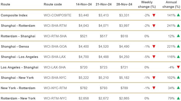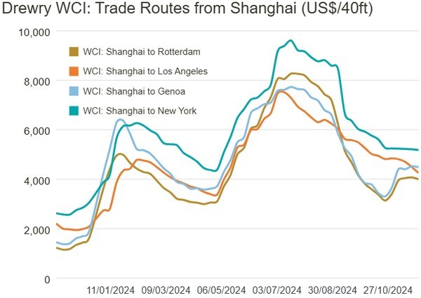 De vrachttarieven van Shanghai naar Los Angeles daalden met 5% of $ 238 tot $ 4.250 per feu en die van Shanghai naar Rotterdam daalden met 2% of $ 74 tot $ 3.997 per feu. Ook de tarieven van Shanghai naar Genua, Shanghai naar New York en New York naar Rotterdam daalden met 1% naar respectievelijk $4.490, $5.182 en $789 per feu. Ondertussen bleven de tarieven van Rotterdam naar Shanghai, Los Angeles naar Shanghai en Rotterdam naar New York stabiel. Drewry verwacht dat de spotprijzen volgende week stabiel zullen blijven.
