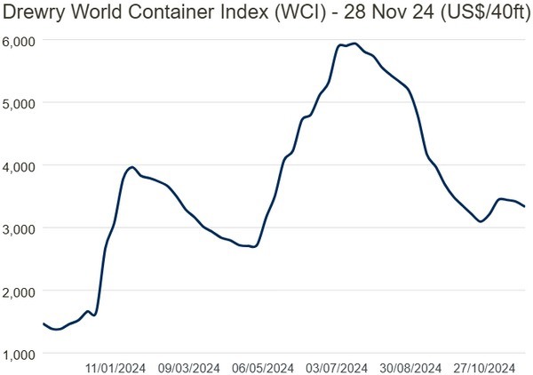 De World Container Index van Drewry daalde afgelopen week met 2% naar $3.331 per 40ft container. Dit is 68% lager dan de piek van $10.377 tijdens de pandemie in september 2021, maar nog steeds 134% hoger dan het gemiddelde tarief van $1.420 in 2019.