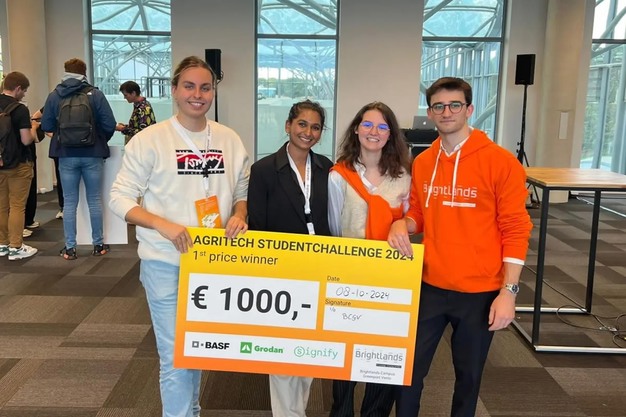 Sanji Kichenin, Mael Sicourmat, Jessica Coiffard en Henry Noel studeren International Business aan Zuyd Hogeschool in Maastricht. Sanji, Mael en Jessica zijn uitwisselingsstudenten van de Kedge Business School in Bordeaux. Henry komt uit België en studeert voltijd in Maastricht. Samen met veertig andere studenten doken zij op 8 oktober tijdens het Brightlands AgriTech Event in de uitdagingen van BASF, Grodan en Signify.