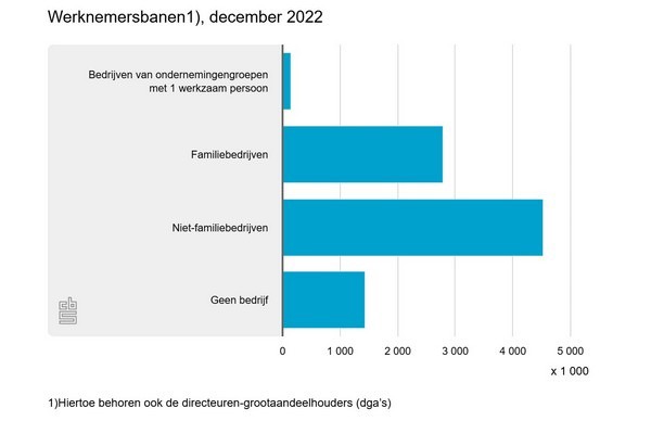 Familiebedrijven zorgden voor bijna 2,8 miljoen werknemersbanen in 2022, dat is ruim 31 procent van het totaal aantal werknemersbanen. Bedrijven en instellingen die niet in familie-eigendom waren, telden ruim 4,5 miljoen werknemersbanen. De overige werknemersbanen zijn banen bij instellingen zoals overheids- en onderwijsinstellingen (1,43 miljoen) en bij ondernemingen met 1 werkzaam persoon (158 duizend).