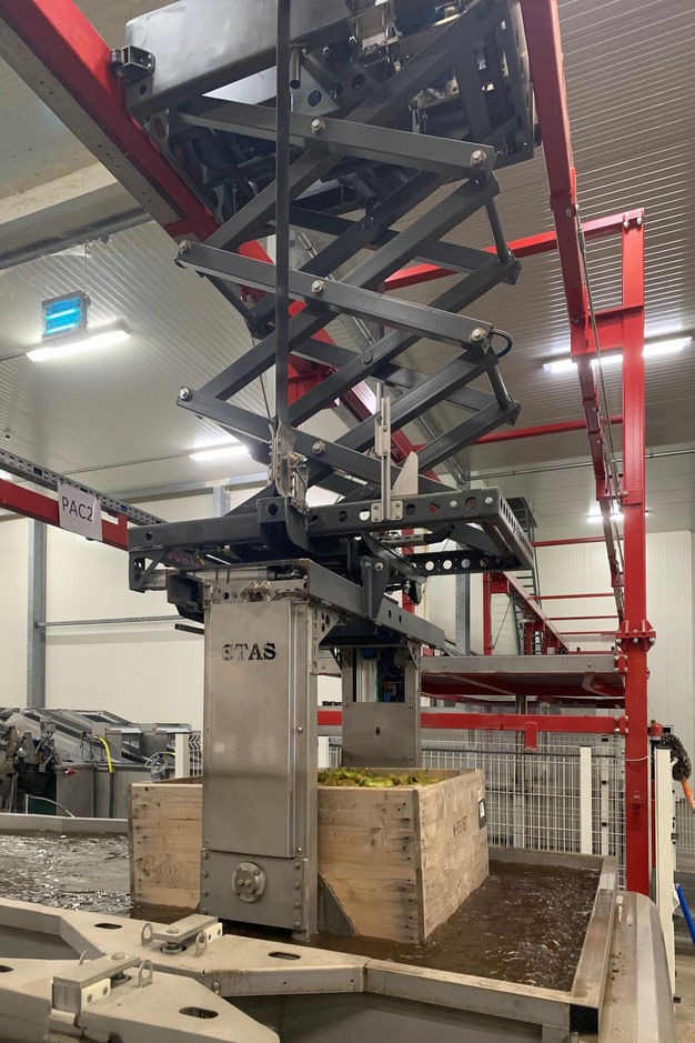 Voor STAS was dit overigens niet de eerste samenwerking met Festo want beide werkten eerder al samen aan de ontwikkeling van een portaalrobot die grote fruitbakken kan ledigen in een waterbak. In de sector wordt vaak gebruik gemaakt van watertransport om fruit niet te beschadigen. Om de robot ook geschikt te maken voor het werken met peren werden enkele aanpassingen doorgevoerd . Peren - in tegenstelling tot appels - zinken in water. Daarom werd voor de waterbak aan de start van het transport een bewegende bodem ontwikkeld, die met cilinders naar boven geduwd kan worden om de peren aan de oppervlakte in de waterstroom te brengen naar de transportband. De beweging van de cilinders wordt daarbij perfect gesynchroniseerd om de bodem vlak te houden.