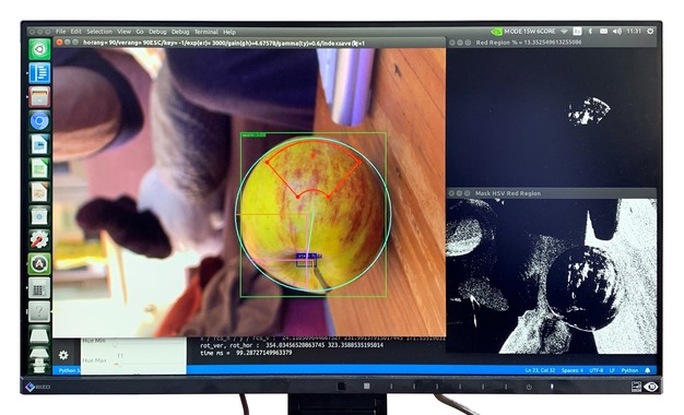 Centraal in de verpakkingsmachine staat een unit die speciaal voor deze toepassing ontwikkeld werd en die een tumbler genoemd wordt. Het is een kuipje met onderin twee transportbandjes waarmee een stuk fruit gekanteld en geroteerd kan worden. In de machine bevinden zich acht van deze tumblers, met daarboven camera's waarvan de beelden naar een neuraal netwerk gestuurd worden. Dat gaat in de beelden op zoek naar de positie van het steeltje. Bij appels kan op dat moment ook bepaald worden waar de rode kleur zit die men in de verpakking bovenaan zichtbaar wil hebben.