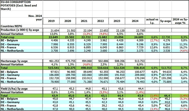 De meeste aardappeltelers in de NEPG-zone (België, Frankrijk, Duitsland en Nederland) hadden in oktober en begin november geluk dat ze hun oogst konden binnenhalen, al gebeurde dat soms onder moeilijke en kostbare omstandigheden. Een deel van de geoogste aardappelen moest echter snel worden afgevoerd, omdat ze door problemen met de kwaliteit tijdens de zomer of slechte oogstomstandigheden, maar kort konden worden opgeslagen. De algehele kwaliteit van de oogst is echter goed, met aardappelen die voldoende groot en lang zijn. Bij het verder verwerken en afvoeren van de aardappelen moet echter wel rekening worden gehouden met een hogere mate van afval (zoals groene plekken of rot).