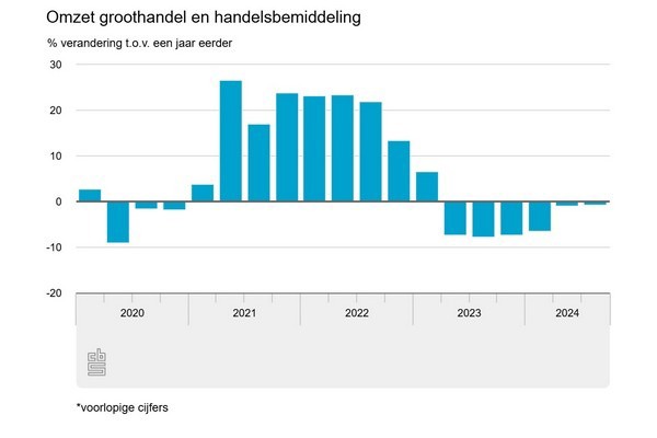 In het derde kwartaal van 2024 heeft de groothandel en handelsbemiddeling 0,6 procent minder omgezet dan in hetzelfde kwartaal een jaar eerder. De omzetontwikkeling is daarmee voor zes kwartalen op rij negatief. Dit meldt het CBS op basis van nieuwe cijfers.
