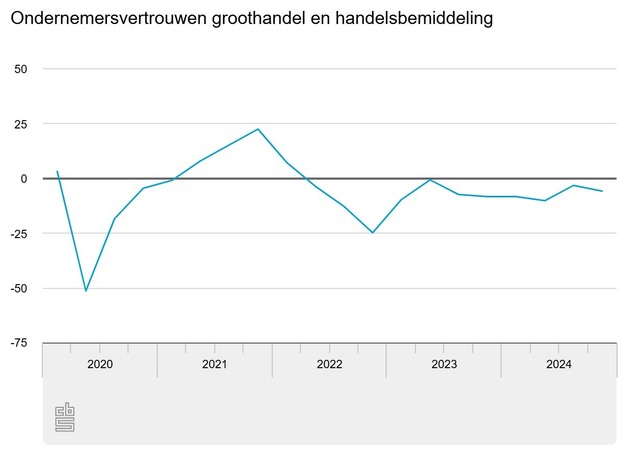 Het ondernemersvertrouwen voor de groothandel en handelsbemiddeling is gedaald. Het ondernemersvertrouwen in de groothandel en handelsbemiddeling was -5,8 punten aan het begin van het vierde kwartaal van 2024. Daarmee was het vertrouwen van ondernemers 2,6 punten lager dan een kwartaal eerder. Ook het ondernemersvertrouwen voor het totale bedrijfsleven was negatief (-3,1 punten), maar iets minder negatief dan een kwartaal eerder.