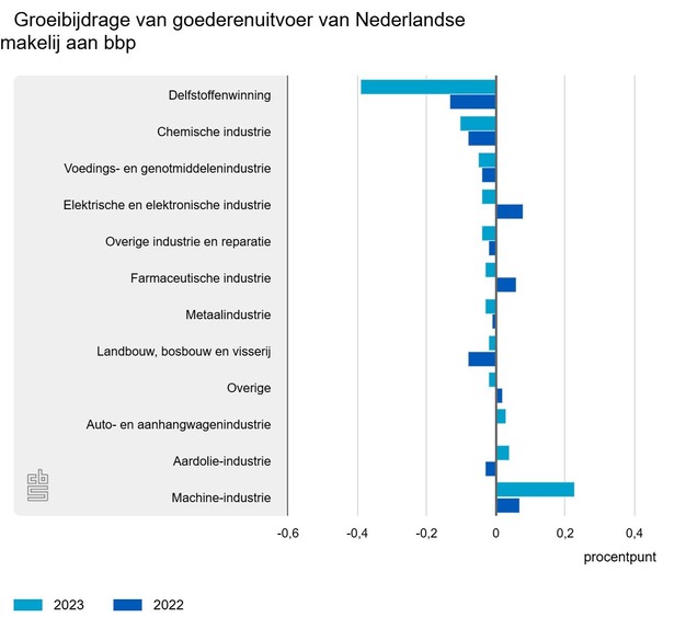 De uitvoer van Nederlandse makelij van de machine-industrie groeide de afgelopen twee jaar wel. Exportvolumes van goederen van Nederlandse makelij van deze bedrijfstak groeiden in 2023 met 16 procent, goed voor een groeibijdrage aan het bbp van 0,2 procentpunt. Ook de aardolie-industrie en de auto- en aanhangwagenindustrie hadden een minieme maar positieve groeibijdrage aan het bbp in 2023.