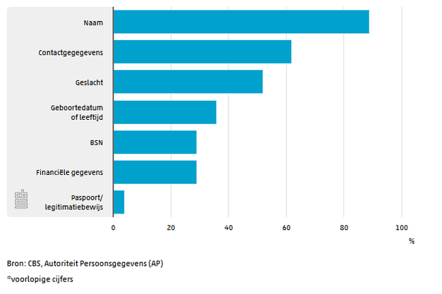 Vaak was bij een datalekmelding de naam van de persoon betrokken (89 procent), gevolgd door contactgegevens zoals adres, woonplaats, e-mail of telefoonnummer (62 procent). Het minst vaak ging het om het paspoort of andere legitimatiebewijzen (4 procent).