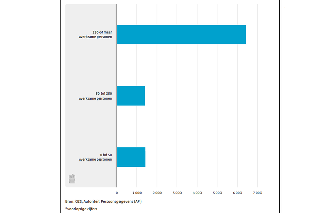 Bijna 7 op de 10 datalekmeldingen werd gedaan door een groot bedrijf of grote organisatie (250 of meer werknemers). Hiermee vertegenwoordigen grote bedrijven of organisaties (0,2 procent van alle bedrijven in Nederland) een relatief groot aandeel in de datalekmeldingen. Veel minder meldingen kwamen van kleinere bedrijven (0 tot 50 of 50 tot 250 werknemers. Beide iets meer dan 1 400 meldingen).